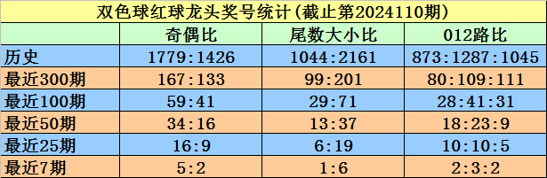 龙头号码余数大小比为1:6,012路比为2:3:2,奇偶比为5:2。